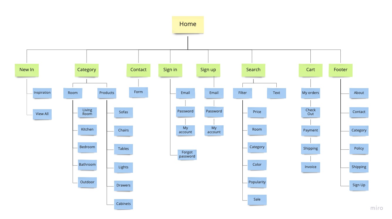 I browsed through similar websites to set a point of reference and to get familiar with the user flow for an e-commerce website. Initially, I started by carrying out my research to gain insight about everything required for a website meant for furniture by browsing through our competitors. I leafed through IKEA, Ashley Furniture and nood. From those websites, I sketched out the user flow of each websites and found some inspirations and drawbacks.